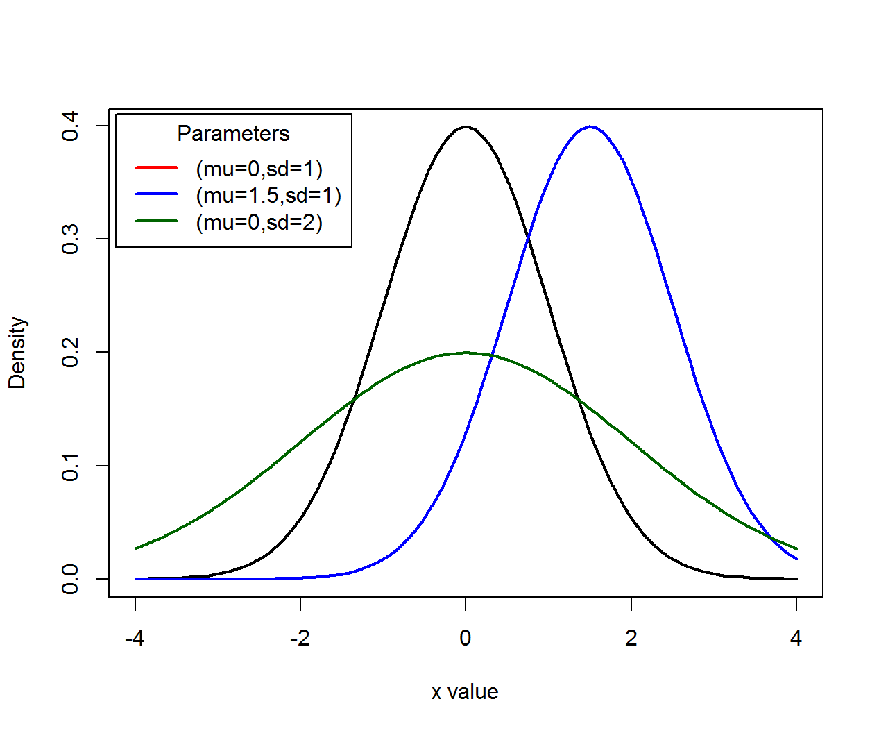 A Normal random variable \(X\) can take any real value, is a continuous random variable, and has density function \[f(x)=\frac{1}{\sqrt{2 \pi} \sigma} \exp{\left[-\frac{(x-\mu)^2}{2 \sigma^2}\right]},\] where \(\mu\) is the “mean” parameter and \(\sigma\) the “standard deviation” parameter.