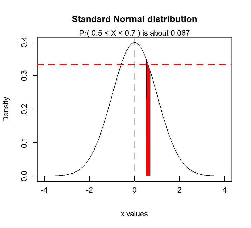 Probability rule, where \(\mu=0\), \(\sigma=1\), \(x_0 = 0.6\), \(I_0=(0.5,0.7)\) and \(f(x_0) \approx 0.333\):