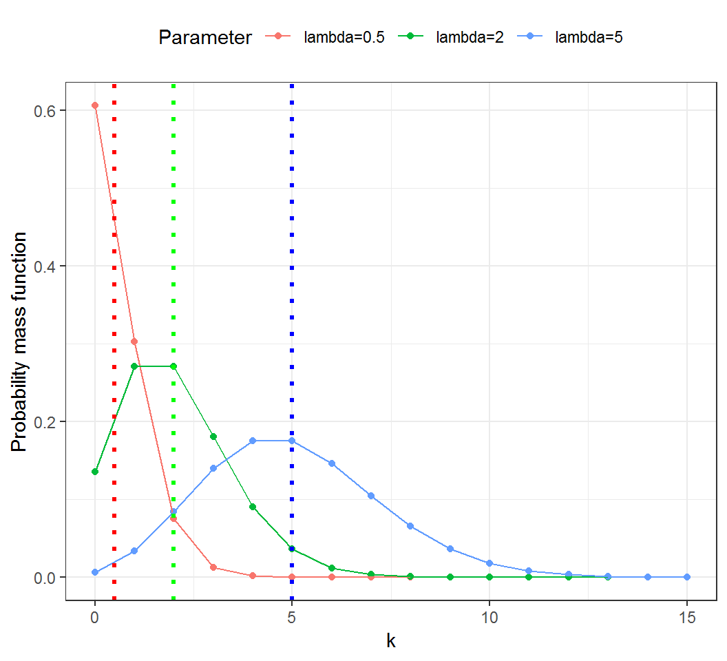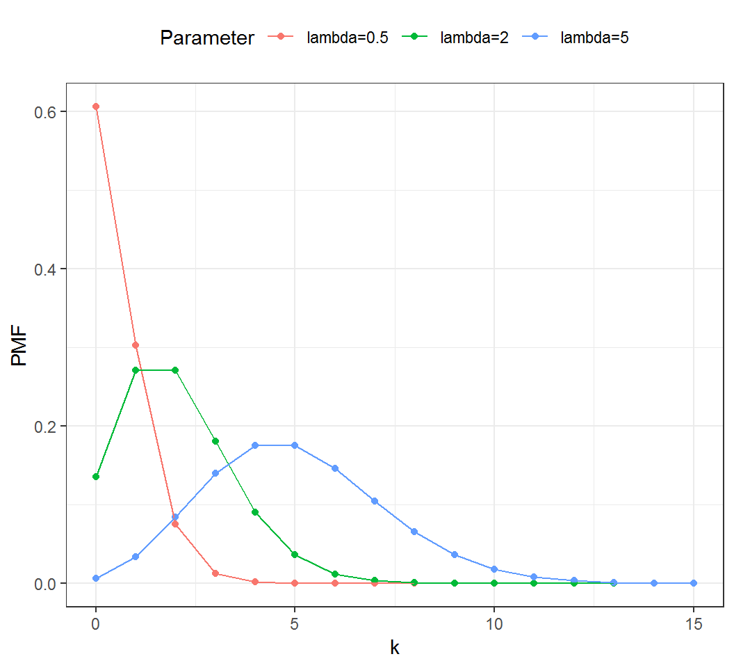 A Poisson random variable with rate \(\lambda >0\) has probability mass function (PMF) \(f\) such that \[\Pr(X = k) = f(k) \quad \text{ and } \quad f(k)= \frac{\lambda^k e^{-\lambda}}{k!}\] for \(k=0,1,2,\ldots\)