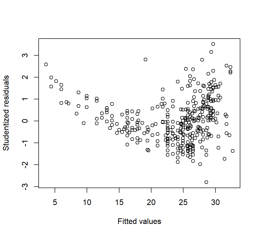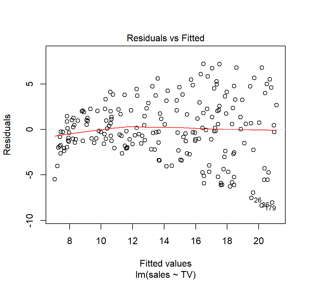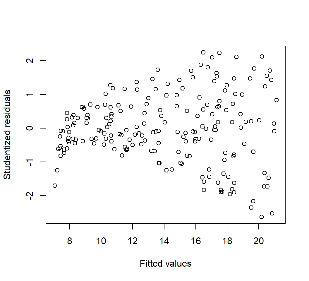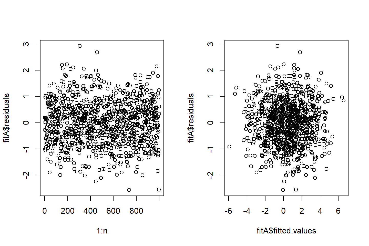 So, the residuals \(e_i\)’s should contain no specific pattern on the fitted values \(\hat{y}_i\)’s or \(x_i\)’s if the model is plausible.