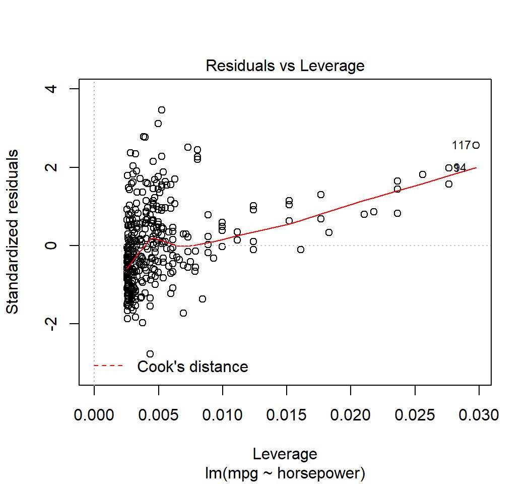 Model \(E\)(mpg) = \(\beta_0\) + \(\beta_1\) horsepower (\(p=1\),\(n=200\),\(\tilde{h}=(p+1)/n=0.01\)):