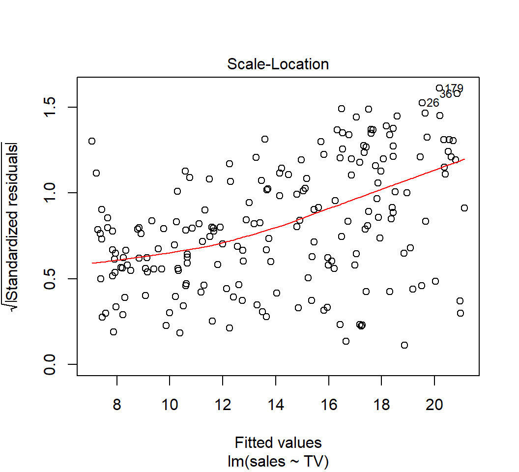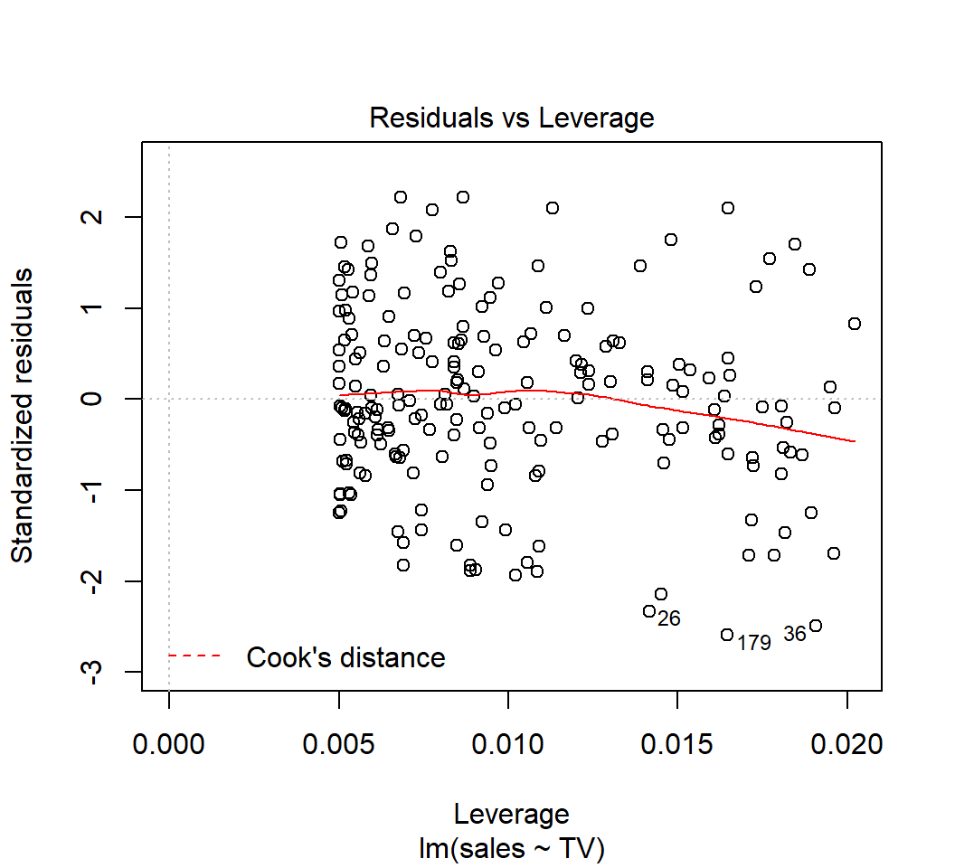 Model: \(E\)(sales) = \(\beta_0\) + \(\beta_1\) TV (\(p=1\),\(n=397\), \(\tilde{h}=(p+1)/n \approx 0.005\)):