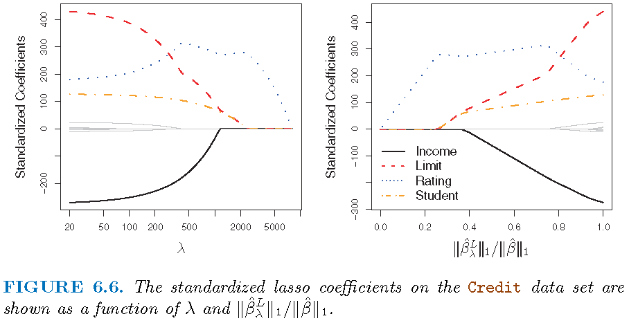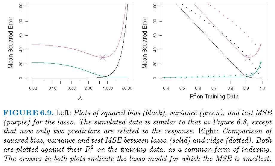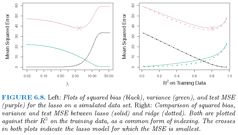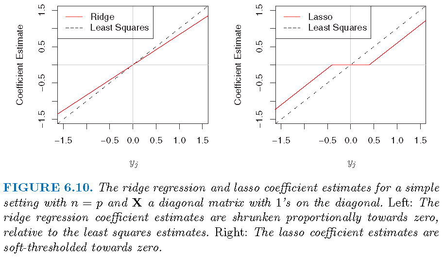 \[\hat{\beta}_{j,\lambda}^L = \left\{ \begin{array} {lll} 0 & \text{if} & \vert y_j \vert \le \lambda/2 \\ y_j -\lambda/2 & \text{if} & y_j > \lambda/2 \\ y_j +\lambda/2 & \text{if} & y_j < -\lambda/2 \end{array}\right. \] Note: compare the above with LSE \(\hat{\beta}_j=y_j\) and ridge estimate \[\hat{\beta}_{j,\lambda}^R=y_j/(1+\lambda)\]