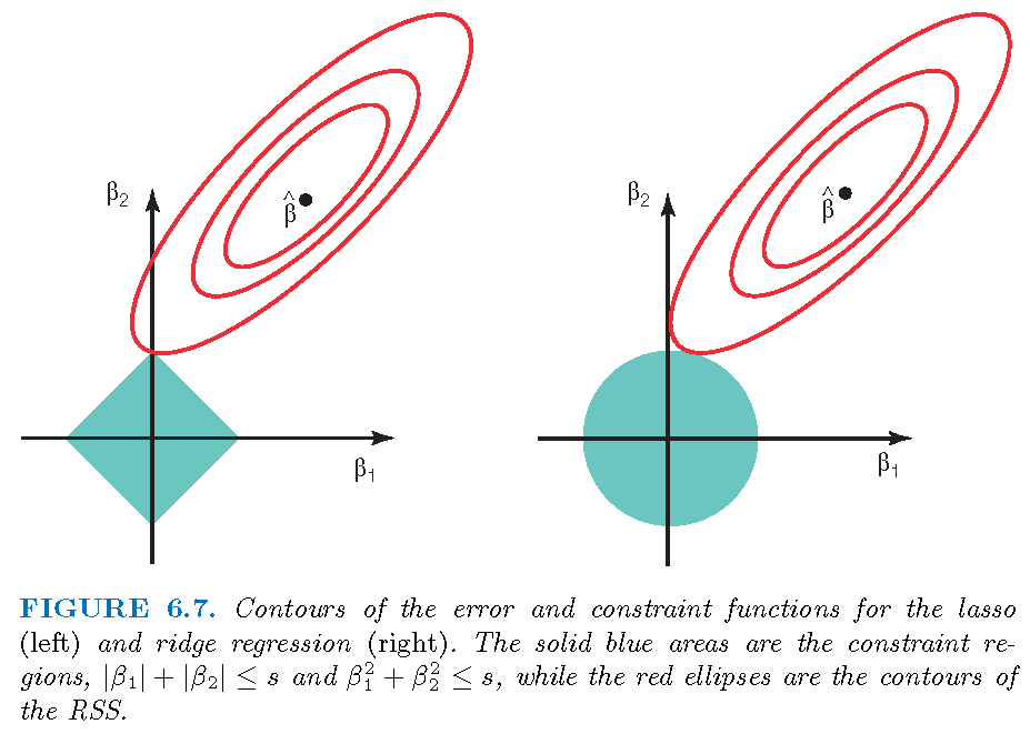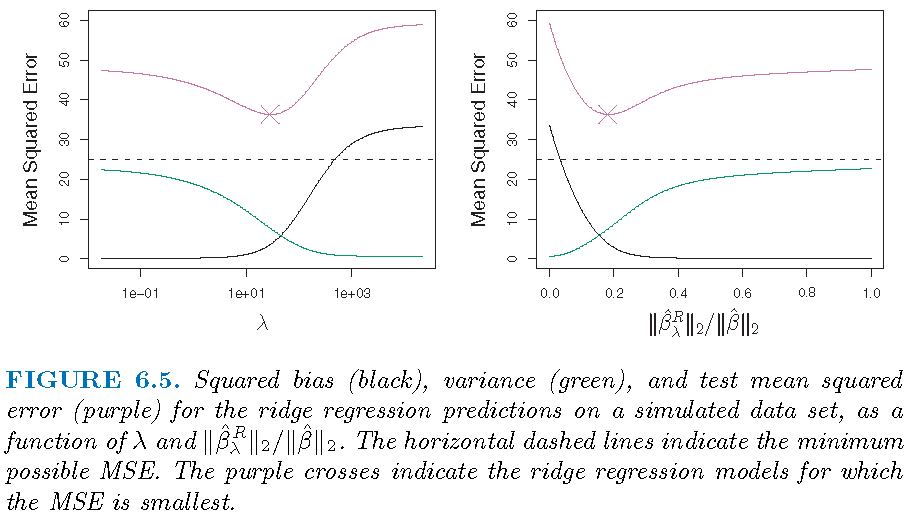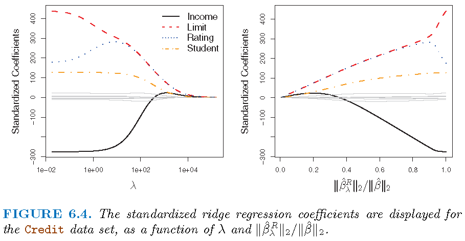 If the variables \(X_i,i=1,\ldots,p\) are centered, i.e., the columns of \(\mathbf{X}\), to have mean zero before ridge regression is performed, then the estimated intercept will be \[\hat{\beta}_0=\bar{y}=\sum_{i=1}^n y_i/n\]