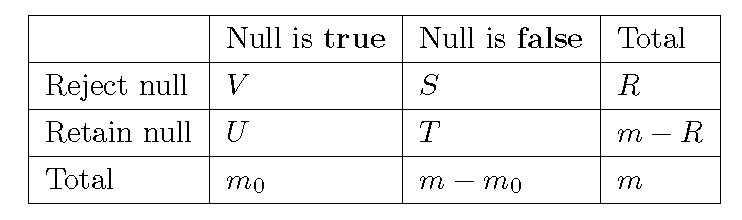 Family-wise error rate (FWER): \[\Pr(V \ge 1) = 1 - \Pr(V=0)\]