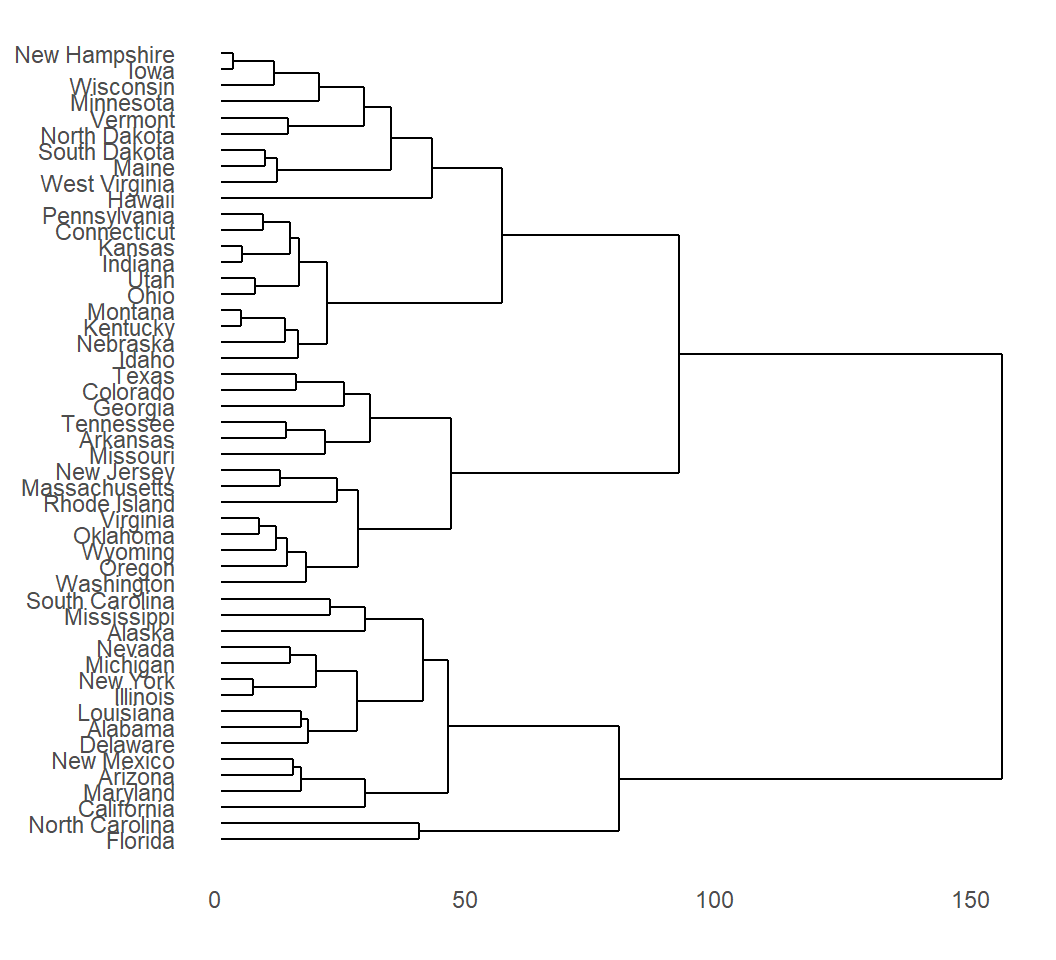 Murder, Assault, RapeUrbanPop (percent of population living in urban areas)> library(ggplot2); library(ggdendro); head(USArrests)