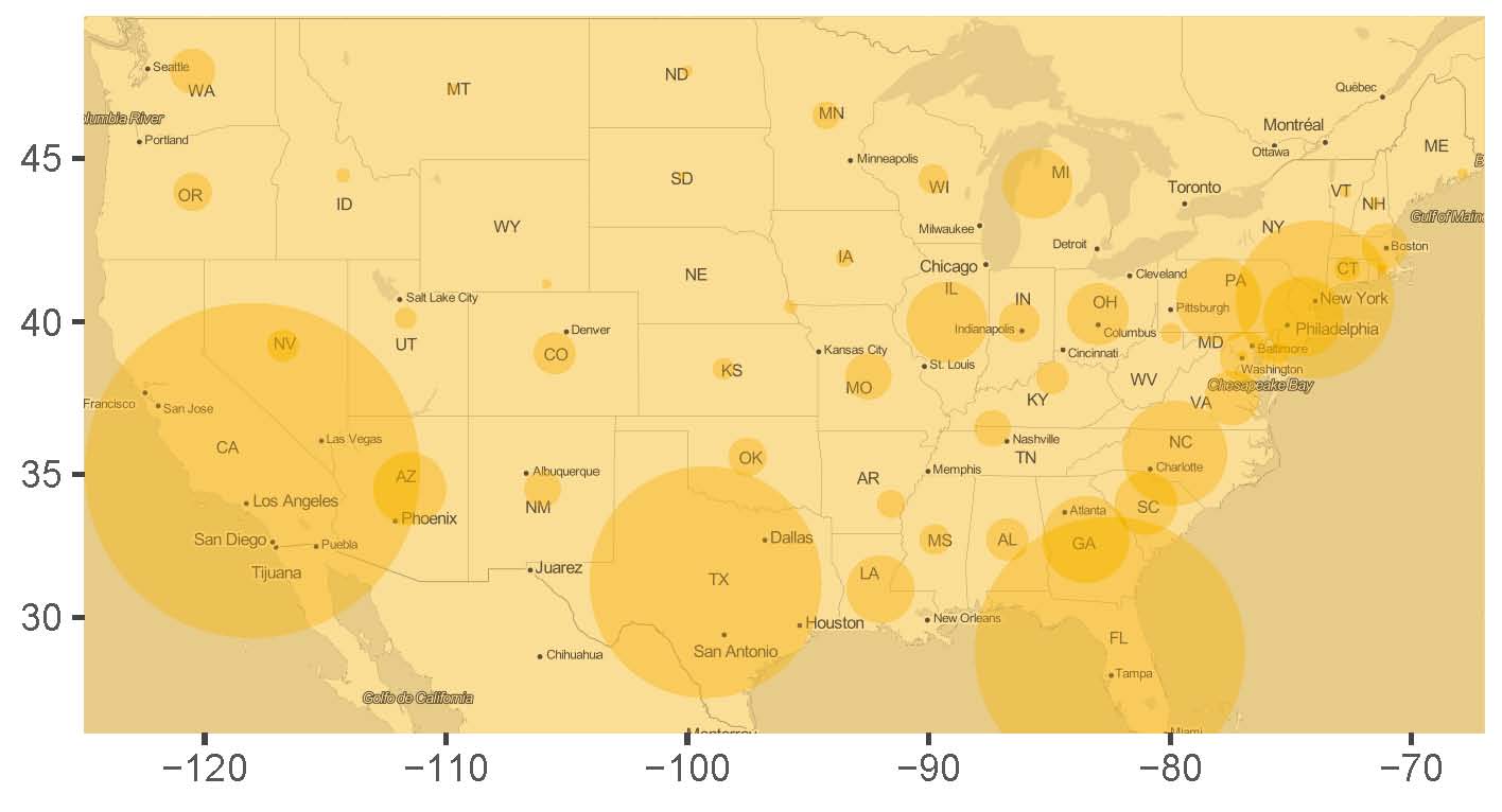 circle_scale_amt sets scaling parameter for the circles to be overlayed on mapscale_size_continuous(range=NULL) specifies the minimum and maximum sizes of plotting symbol (“circle” in this example) after transformationslabs(x = "",y=""): no labels for axes> us <- c(left = -125, bottom = 25.75, right = -67, top = 49)