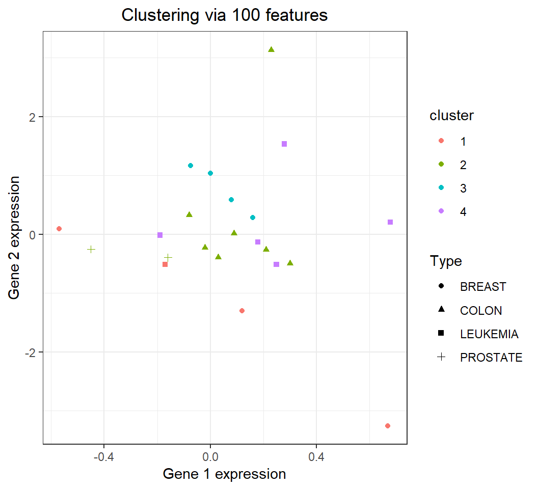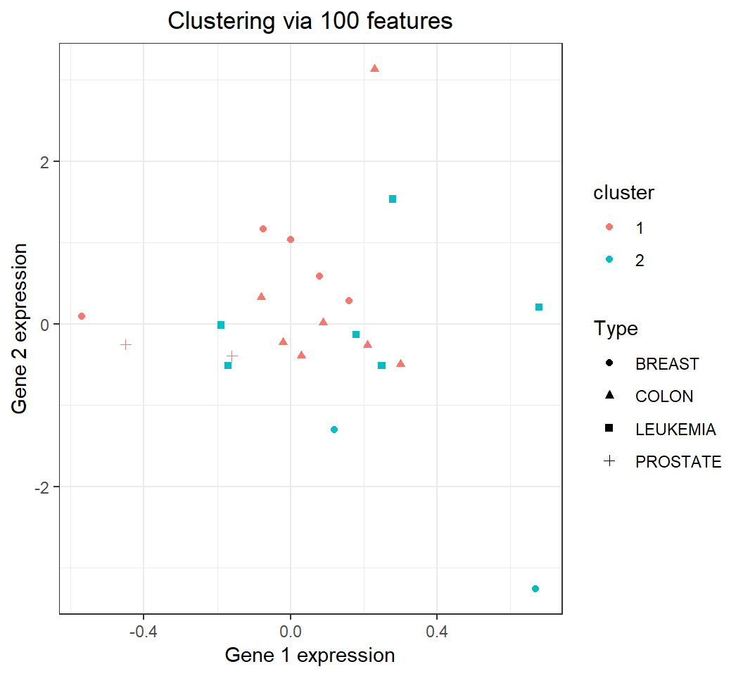 + ggtitle("Clustering via 100 features")+