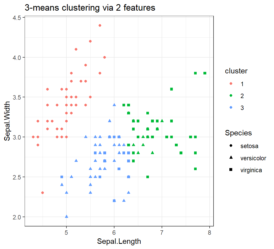 cluster: a vector of integers (from \(1\) to \(K\)), the value \(k_i\) of whose \(i\)th entry indicates that the \(i\)th observation is assigned to Cluster \(k_i\), where \(K\) is the number of clusters to formcenters: a matrix of cluster centers (i.e., centroids), whose \(j\)th row contains the coordinates of the centroid of Cluster \(j\)tot.withinss: total within-cluster sum of squareskmeansx must contain the \(i\)th observation of features in its \(i\)th rowkmeans cannot be applied to non-numerical data xx,nstart values may give different clustering results since K-means algorithm may converge to different local optima of the loss function under different initial configurationsiter.max values may give different clustering results since intermediate results of K-means algorithm may differ at different iterations (before it converges to any local optimum of the loss function)Codes to generate data: