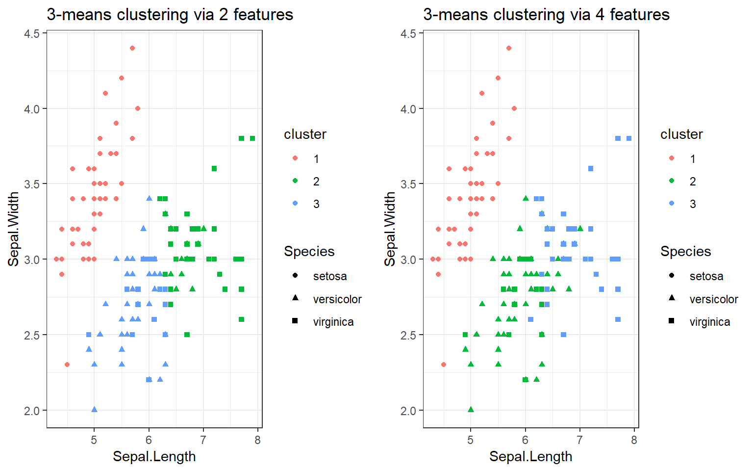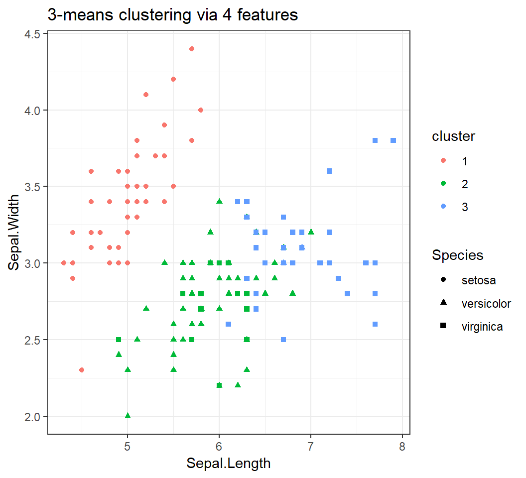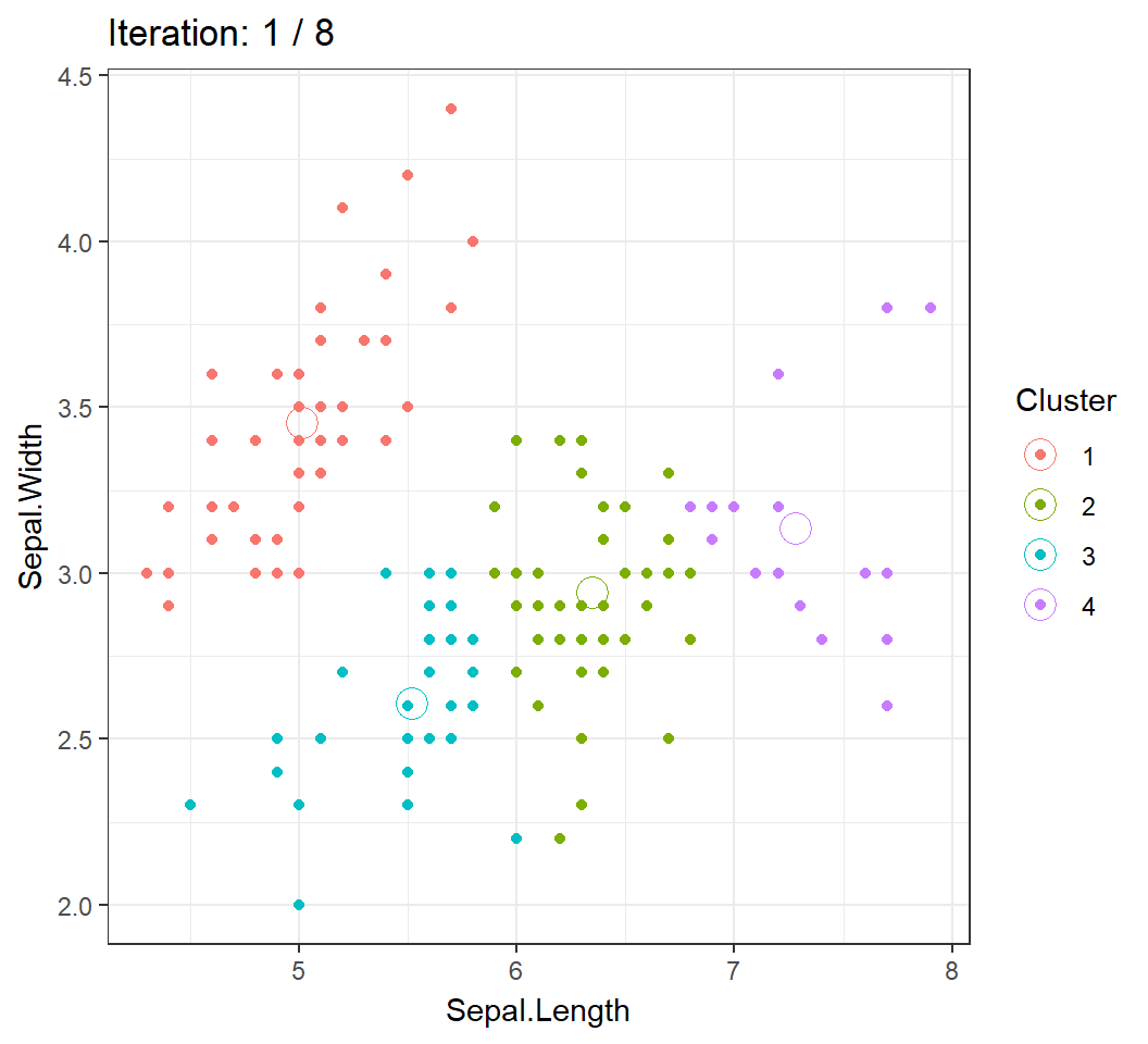 We will visualize the Algorithm by clustering the observations into \(4\) clusters using 2 features Sepal.Length and Sepal.Width.