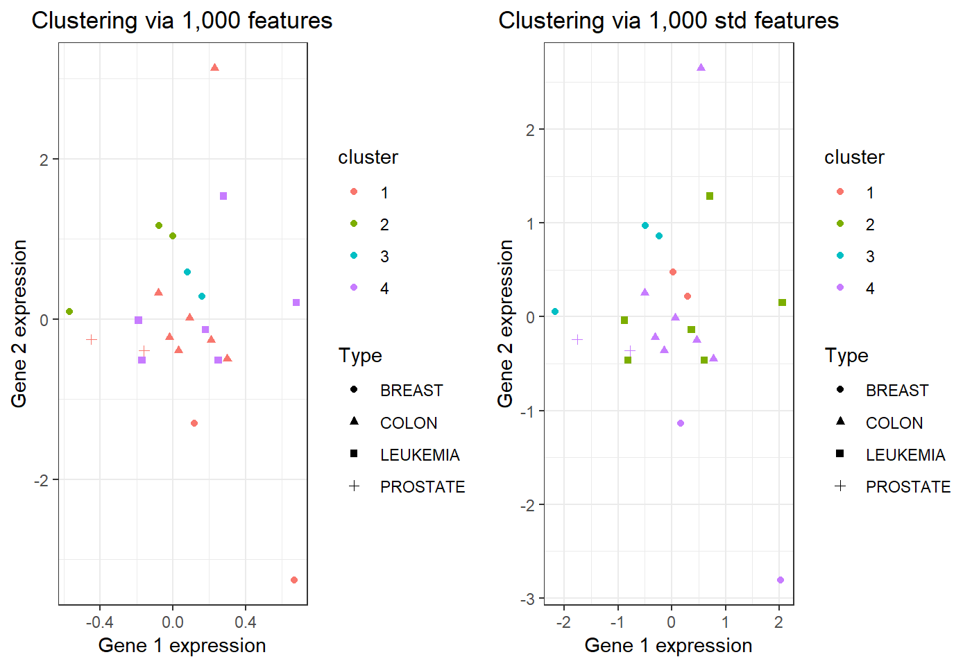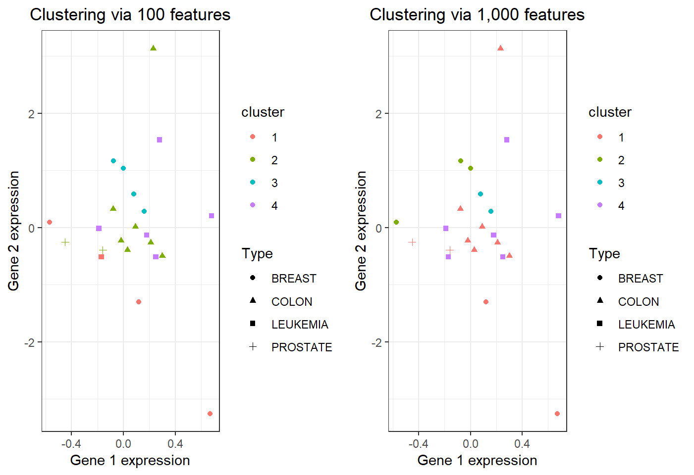 kmeans is applied to the transpose t(nci_a1) of nci_a1iter.max = 30: to make k-means algorithm more likely to convergePlot the expressions of the 1st and 2nd genes in nci_a1 (to track observations), coloring via kmeans cluster membership and assigning shape via cancer type: