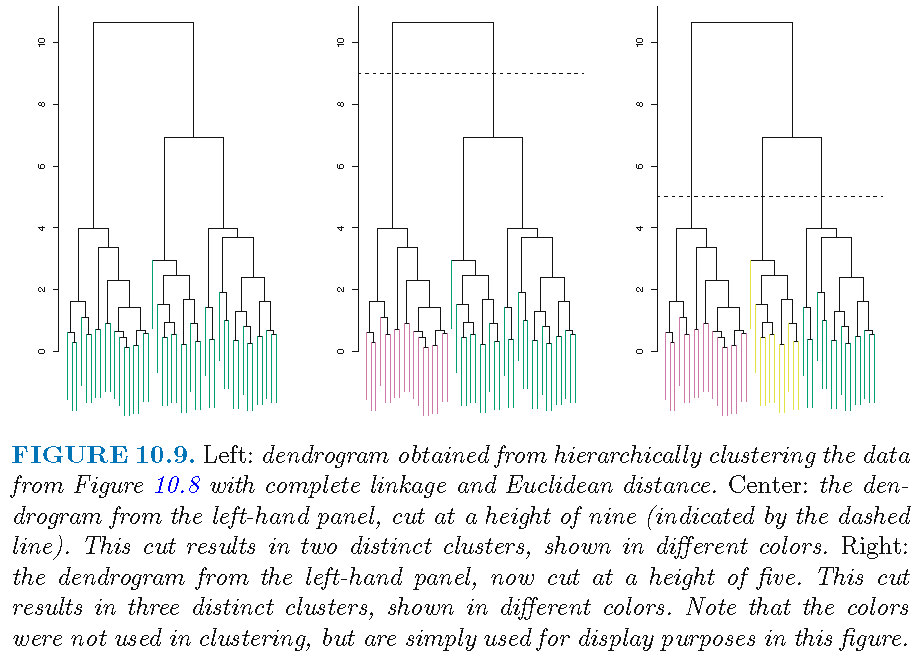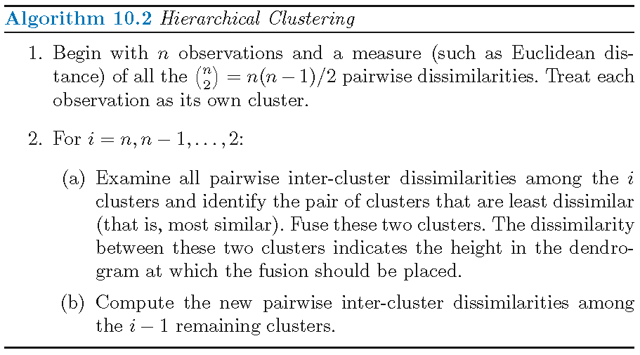 Using some dissimilarity measure, hierarchical clustering will split the \(n\) observations \(\boldsymbol{x}_i\) into sets of clusters at different dissimilarity levels (i.e., at different heights)