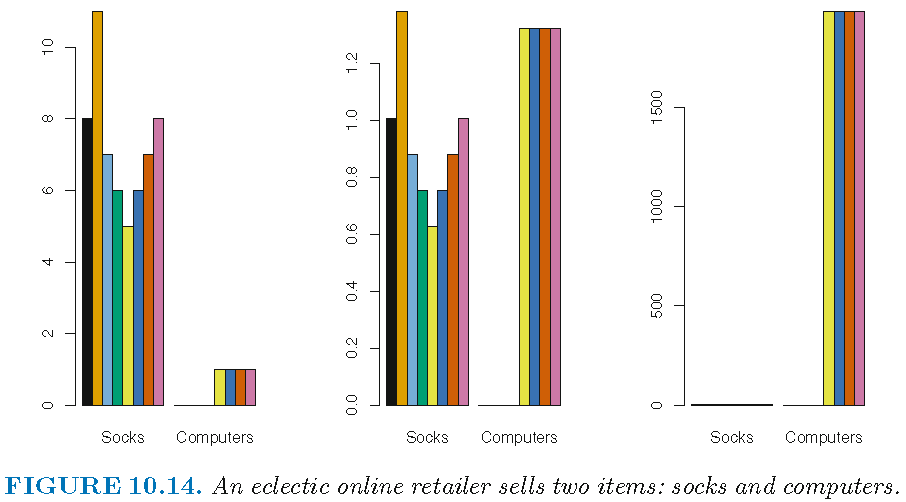If we choose a dissimilarity measure that is easily affected the magnitudes of observations, then high-frequency purchases like socks tend to have a much larger effect on the inter-shopper dissimilarities, and hence on the clustering ultimately obtained, than rare purchases like computers. This may not be desirable.