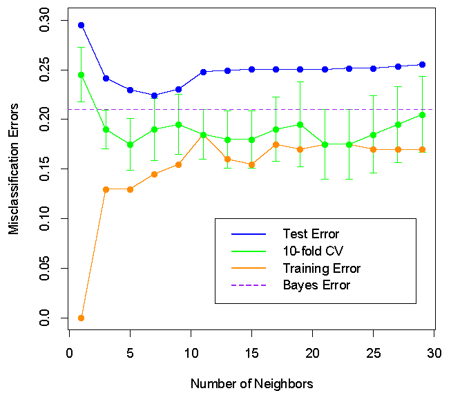 So, it is important (but not easy) to choose a neighborhood size \(k\), not too small and not too large, to obtain good classification performance for a kNN classifier