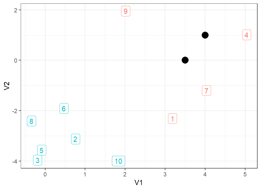10 observations form 2 classes (observations 1, 4, 7 and 9 form a class, and the rest form another class):