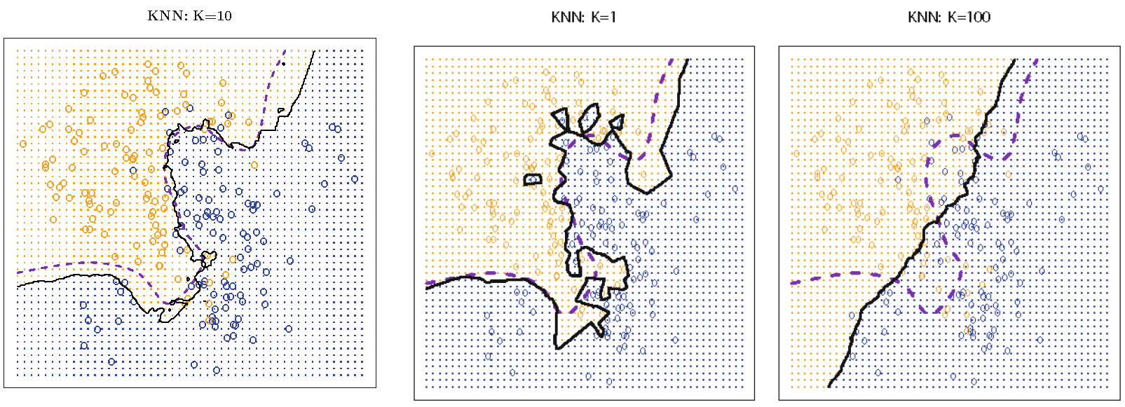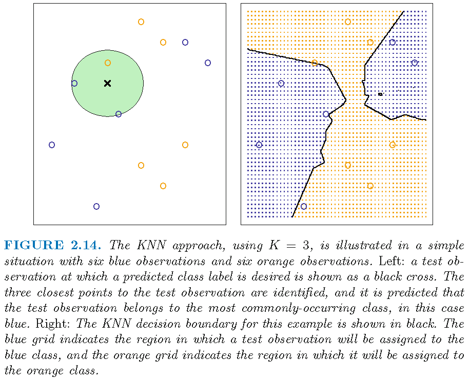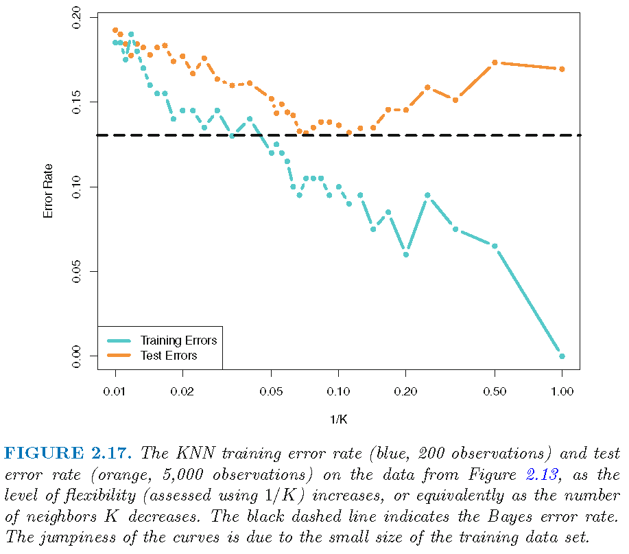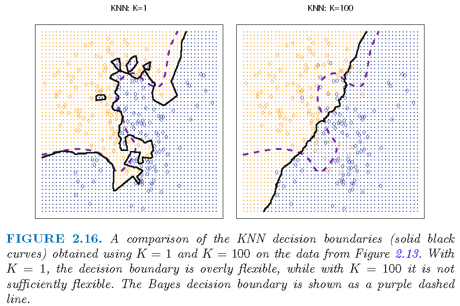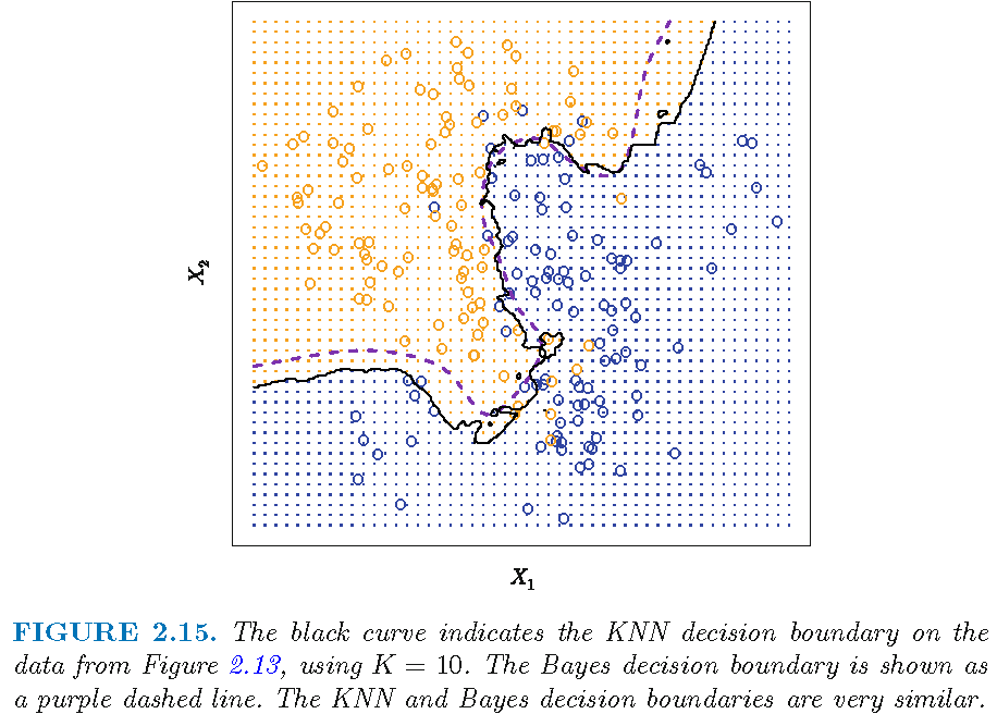 So, when two feature observations \(x\) and \(x'\) are not far apart, their neighborhoods \(N_{k}(x)\) and \(N_{k}(x')\) will not contain quite different \(x_{j}\)’s, leading to similar \(\bar{Y}(x)\) and \(\bar{Y}(x')\) and similar \(\hat{Y}(x)\) and \(\hat{Y}(x')\), and a “insufficiently flexible” decision boundary that is relatively smooth
