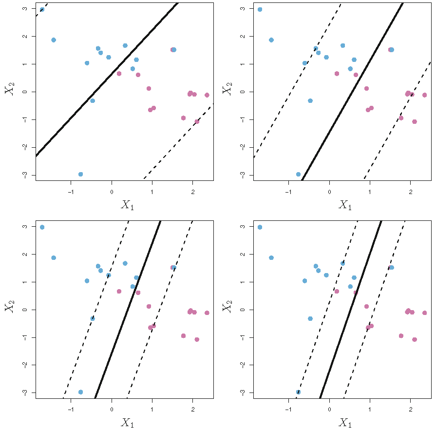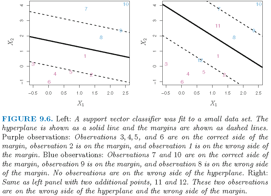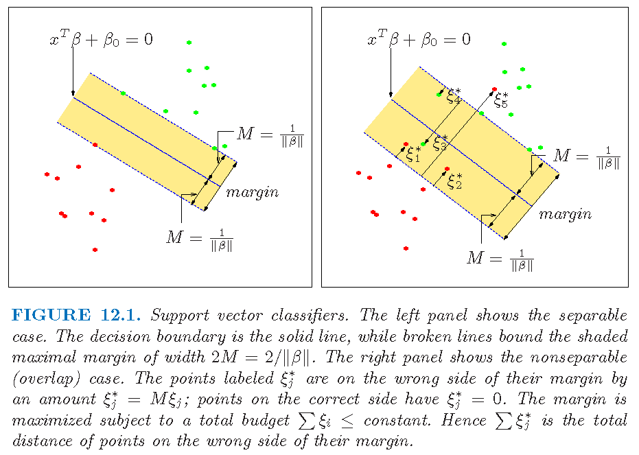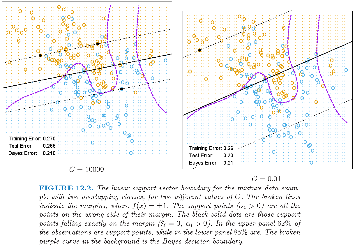 Figure 12.2 of Supplementary Text (\(\alpha_i=a_i,\xi_i=\epsilon_i\)); \(C\) is the cost (smaller \(C\), wider margin):