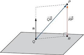 \(\text{dist}(P,S)\) is the orthogonal projection of \(\overrightarrow{QP}\) with \(Q \in S\) onto the normal \(\mathbf{n}\) and is equal to \(\Vert\overrightarrow{RP}\Vert\) (Credit: planes)
