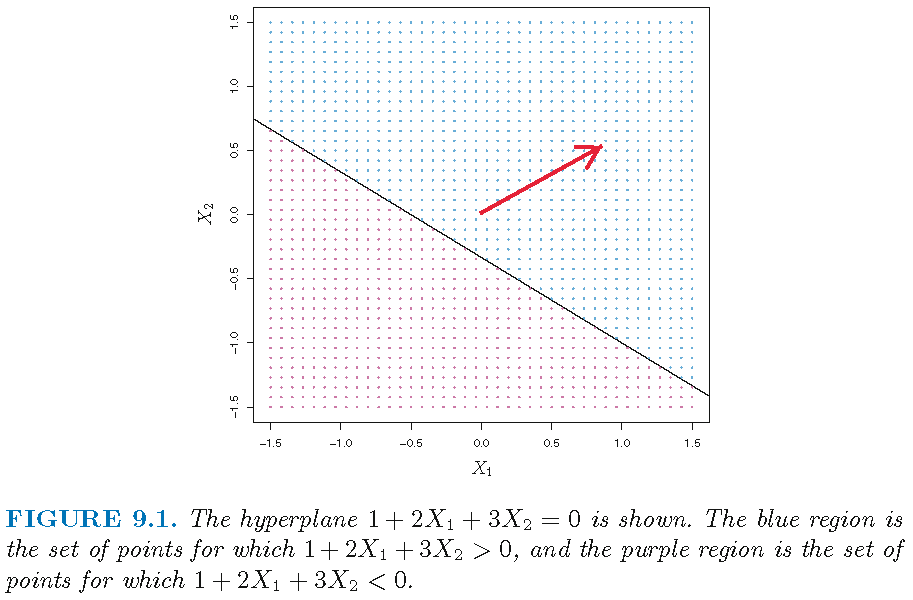 Hyperplane \(S\) via \(\alpha = (\beta_1,\beta_2)^T =(2,3)^T\) and \(\beta_0 =1\); red vector is \(\tilde{\alpha} ={\alpha}/{\Vert \alpha \Vert}=(0.555,0.832)^T\):