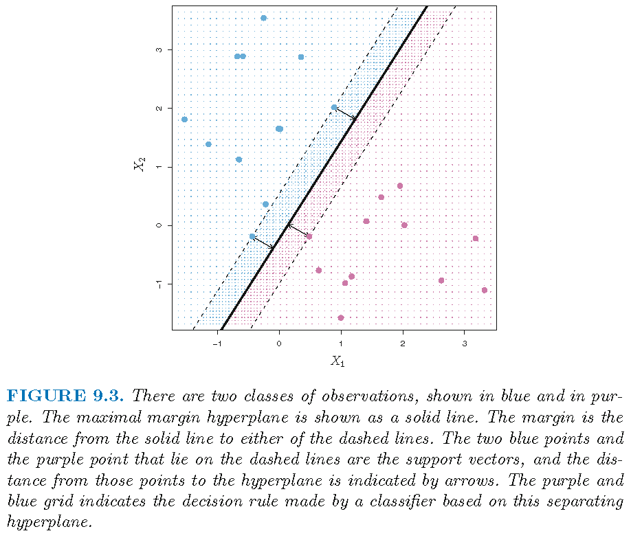 the two hyperplanes that are parallel to \(\hat{S}\), that are on the opposite sides of \(\hat{S}\), and that pass through the support vectors form the margin or boundary (for classification)