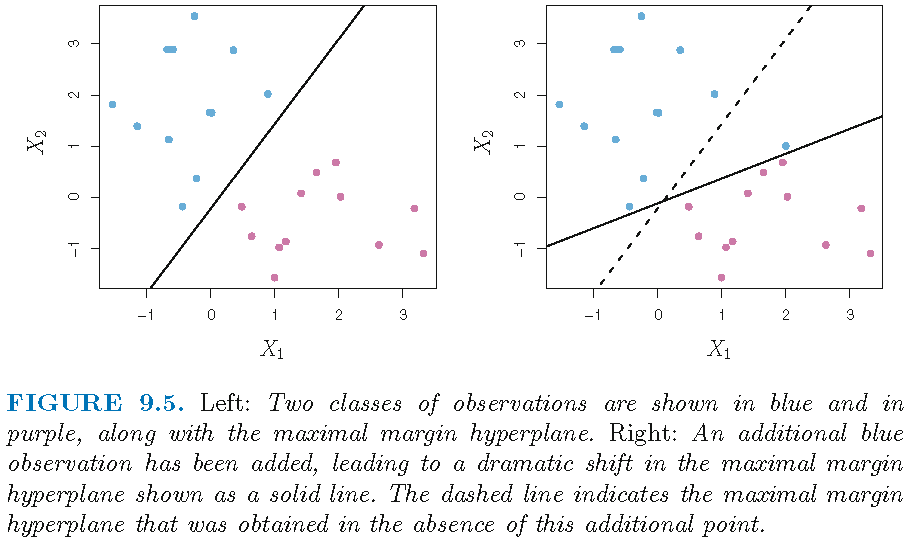 The maximal margin classifier \(\hat{S}(\hat{\alpha},\hat{\beta}_0)\) solves the optimization problem: