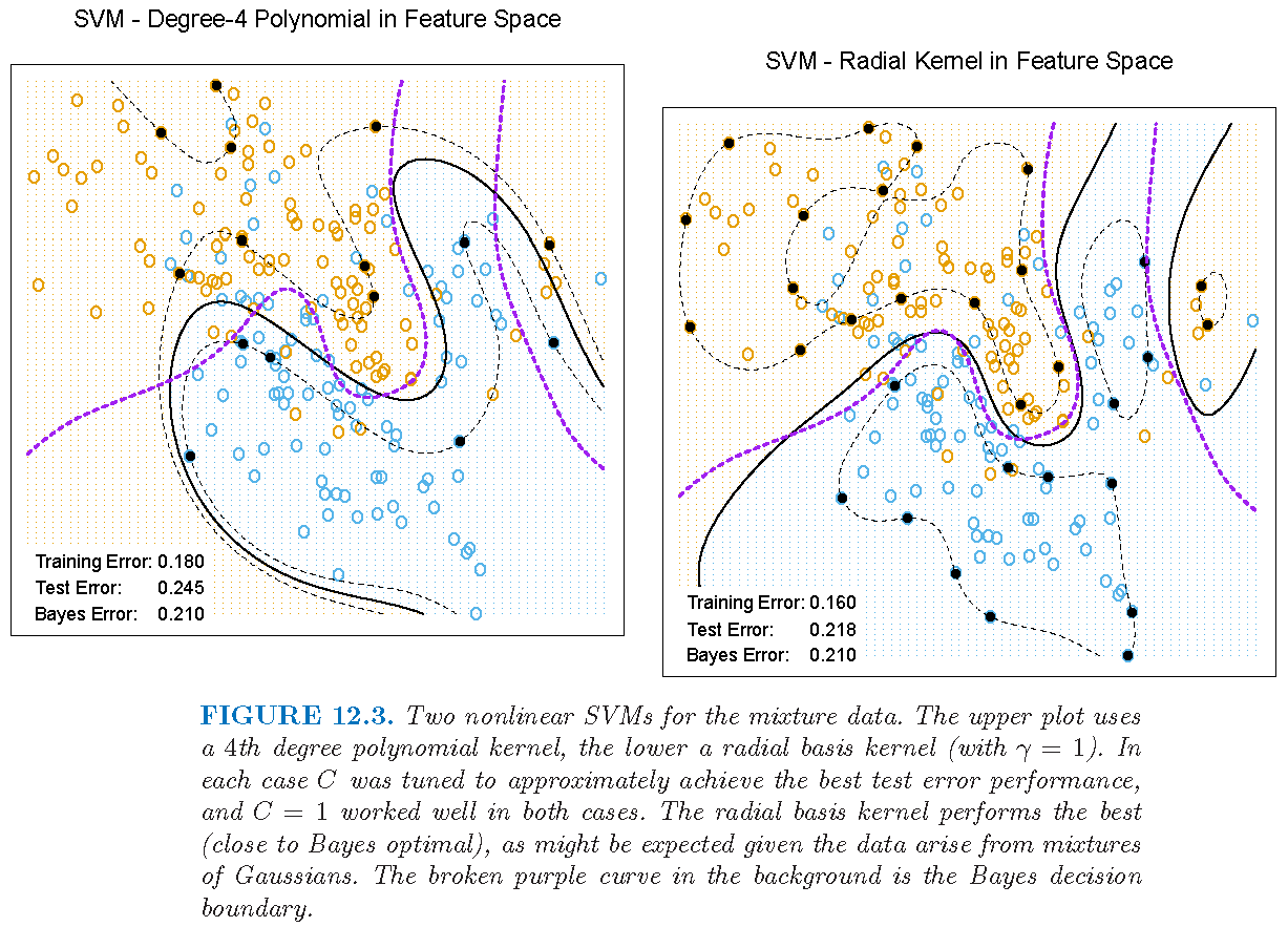 From Chapter 12 of Supplementary Text, we see that an SVM maximizes the “Lagrange dual function” \[ L_{D} = \sum_{i=1}^n a_{i} - 2^{-1}\sum_{i=1}^n \sum_{i'=1}^n a_{i} a_{i'}y_{i} y_{i'} K( x_i, x_{i'}) \] with constraint \(\sum_{i=1}^n a_i y_i =0\) and \(0 \le a_i \le C\)