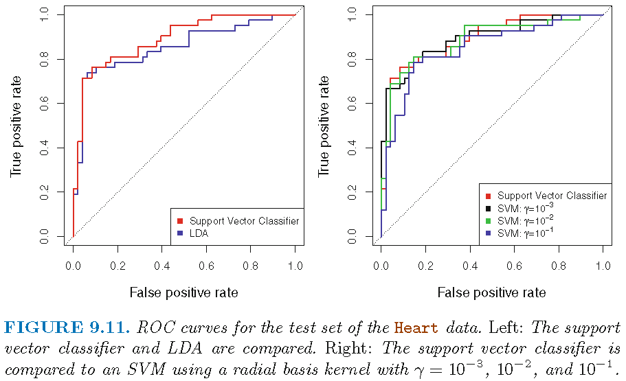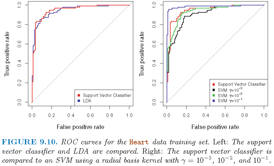 AHD=Yes or AHD=No depending on whether \(\hat{f}(X)<t\) or \(\hat{f}(X) \ge t\)SVC seems to be better than LDA; SVM with \(\gamma=0.1\) radial kernel seems to give perfect ROC curve