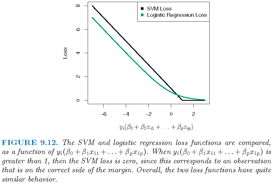 The optimization problem that produces SVC is equivalent to \[ \min_{\beta_0 \in \mathbb{R},\alpha \in \mathbb{R}^p} \left\{ \overbrace{\sum_{i=1}^n \underbrace{\max[0,1-y_i f(x_i; {\beta}, {\beta_0})]}_{\text{hinge loss}}}^{\text{empirical loss } L(\mathbf{X},\mathbf{y})} + \overbrace{\underbrace{\lambda \Vert \beta \Vert^2}_{\text{ridge penalty}}}^{\text{penalty } P(\beta)} \right\} \]