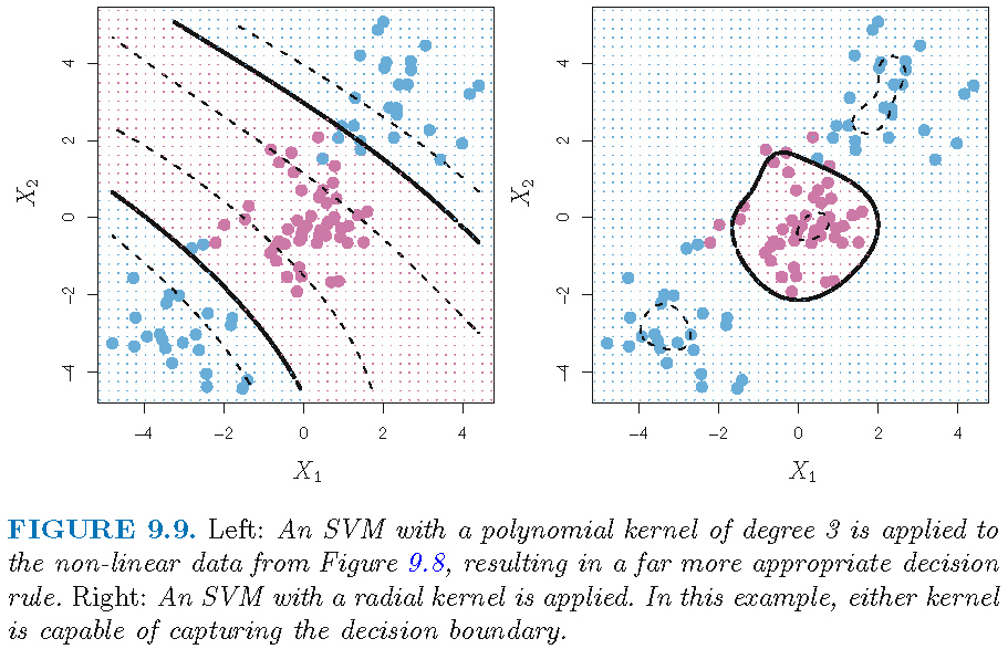 One advantage of using a kernel over explicitly enlarging feature space is that we need only compute \(K(x_i,x_{i'})\) for all \(\binom{n}{2}\) distinct pairs \((i,i')\), without explicitly working in the enlarged feature space