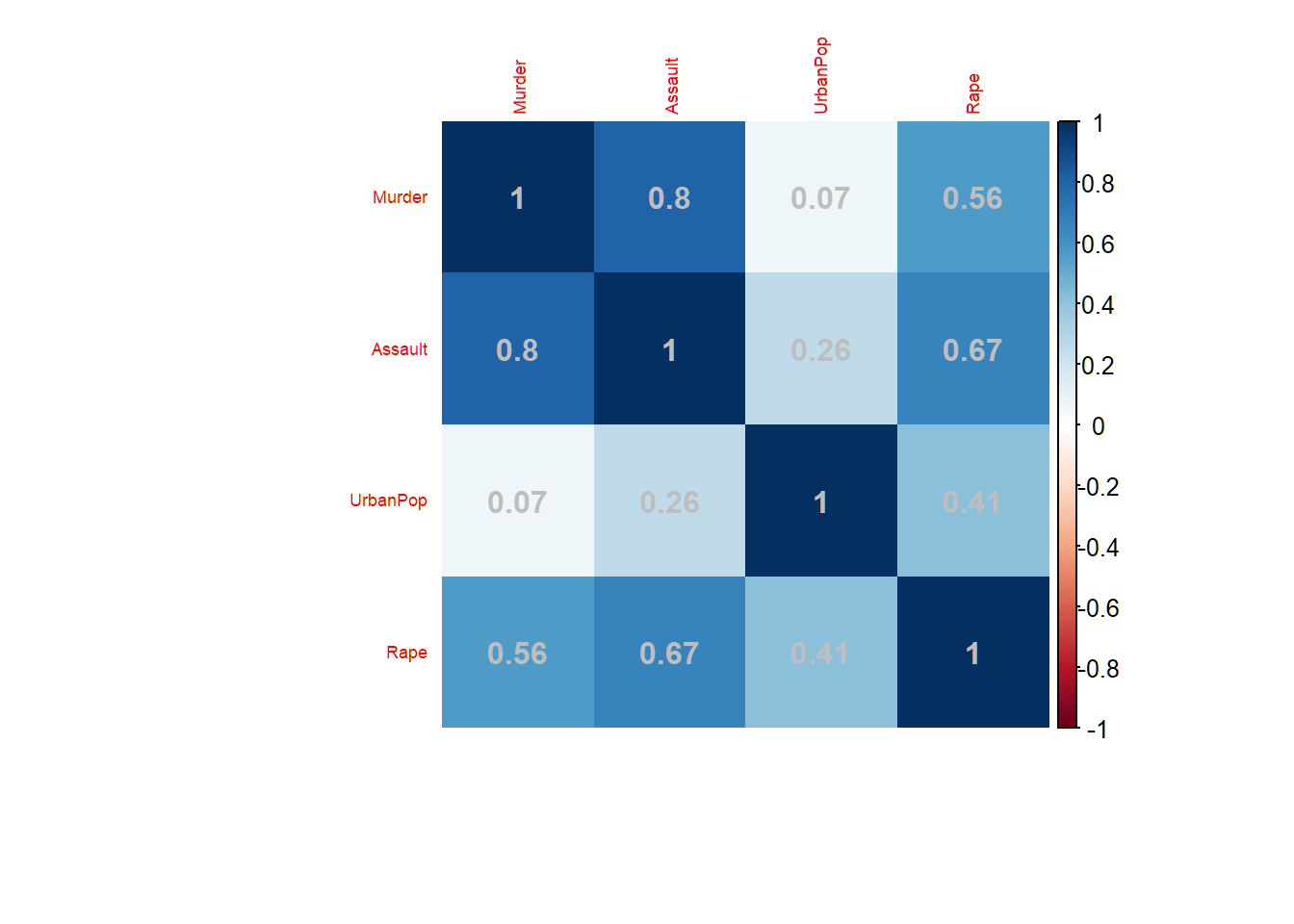 addCoef.col="grey": add correlation coefficient with color; tl.cex=0.57: font size for variables> corMatFeature = cor(USArrests); library(corrplot)