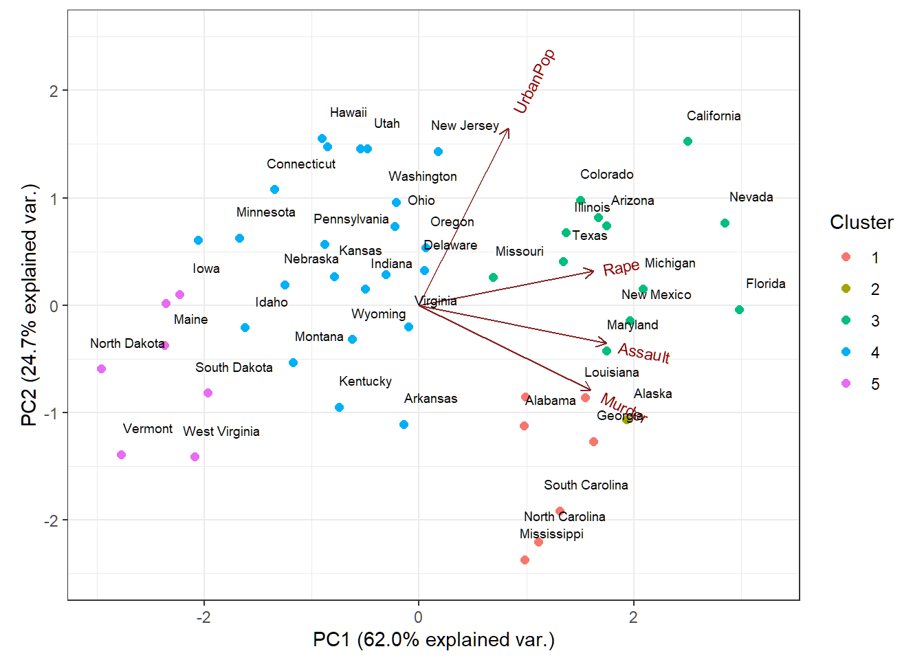alpha: transparency value for the points (0 = transparent, 1 = opaque)var.axes: draw arrows for the variables?varname.size and varname.abbrev: size of the text for and whether or not to abbreviate variable namesvarname.adjust: adjustment factor the placement of the variable names; a value >= 1 means farther from the arrowCluster memberships of US states superimposed on biplot of PCA of USArrests data